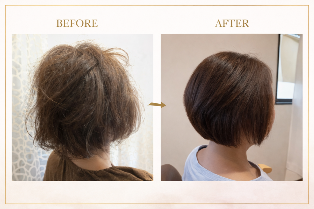 乾燥によるパサつき、うねり、広がりが重なり、まとまりにくい状態でした。施術後は、